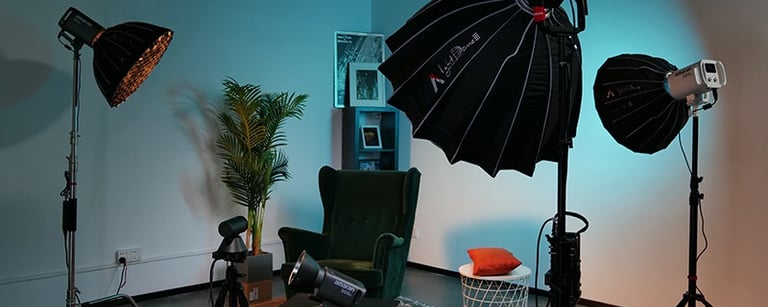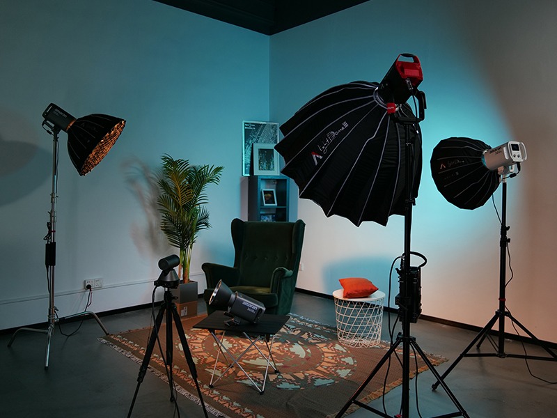 De la minette Led au projecteur plus puissant, je peux éclairer différents styles de scènes : interviews, soirées, packshot... La lumière est douce et naturelle avec mes différentes softbox. La possibilité d'alimenter certaines lumières sur batteries permet de tourner en mobilité et presque n'importe où.